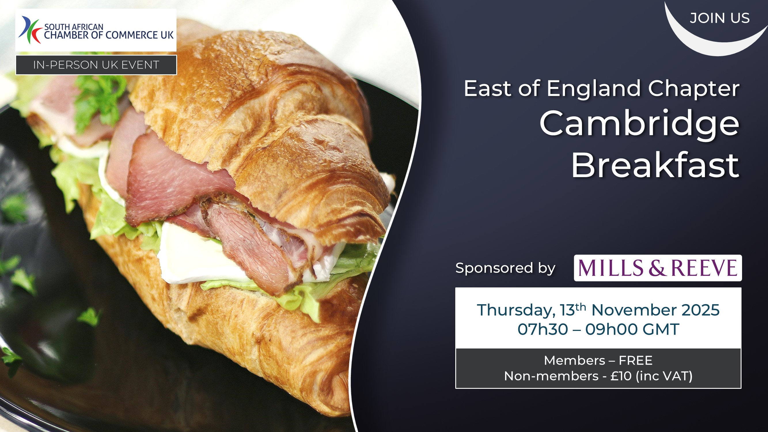 Join us for our monthly South African Business Breakfast in Cambridge from 07:30 to 09:00 on Thursday, 13th November. This event continues to offer an invaluable opportunity to connect with fellow South African professionals in the UK, fostering new relationships, exchanging ideas, and enhancing business networks. With the support of our esteemed sponsor, Mills & Reeve LLP, a leading national law firm with long-standing and deep roots in East Anglia and a strong international outlook, the time is perfect to reconnect. Who Should Attend? If you’re a South African professional based in the UK, or someone in the UK with an interest in South Africa, this event is for you. Whether you’re looking to expand your network or simply connect with like-minded individuals, you’ll find a warm South African welcome here. Why Attend? • Expand your network Getting There: The venue (Botanic House) is a five-minute walk from Cambridge rail station. The closest parking is at the Cambridge rail station, and the nearest Park & Rides are at Babraham Road, about 2 miles south of Botanic House, and Trumpington, about 3 miles from Botanic House. Buses run every 10 minutes to the rail station. Cycle racks are available at both Cambridge station and Botanic House. Booking Details: Booking is essential, as places are strictly limited. To secure your place, please book as soon as possible. Booking is only available via the website and bookings are only final once payment has been received, and may be cancelled if no payment is received within 24 hours. Price: Dietary Requirements: |
