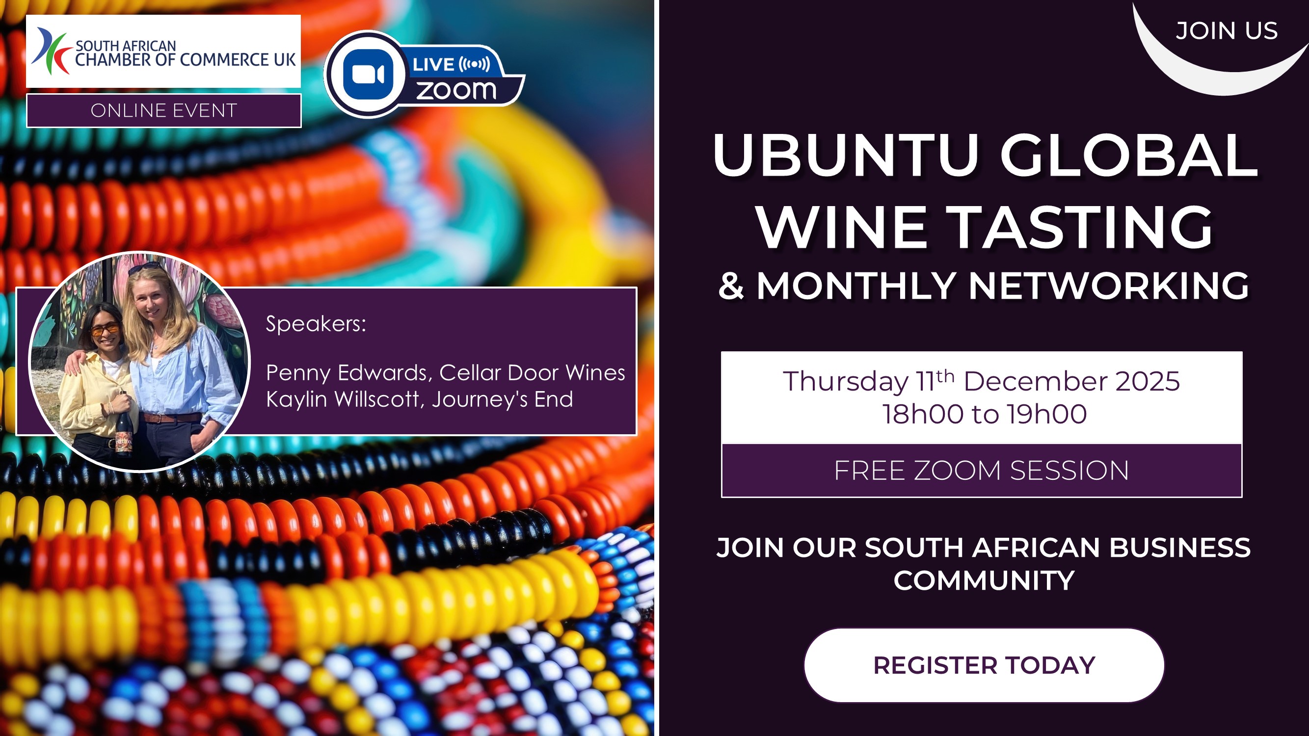 | Join us for our monthly Ubuntu Virtual Global Wine Tasting & Networking event on Thursday 11th December 2025, 18:00 UK time. Chamber member Penny Edwards of Cellar Door Wines, inspired by her recent visit to the Cape Wineland for Cape Wine 2025 has invited Kaylin Willscott from the Journey's End winemaking team to talk to us about her Inzuzo project wines. Penny has created a special SA Chamber Inzuzu Wine Bundle of two bottles and a packet of biltong, that can be purchased ahead of the drinks on the 11th December to be enjoyed on the call or with your other Christmas festivities. For free delivery on the UK mainland use the code SACHAMBERXMAS. Inzuzo means benefit in two of the main South African languages Zulu and Xhosa. The Inzuzo Wine Company is a BEE project spearheaded by Journey's End wines in Stellenbosch and run by one of their talented winemakers, Kaylin Willscott. Kaylin's story is integral to the heart of the Inzuzo brand. As a Cape Wine Guild protégée and one of the few women of colour winemakers in South Africa, her journey is a powerful narrative of talent, determination, and community upliftment in South Africa. Participation is free, but registration is essential. Zoom links will be sent out in the 24 hours prior to the event. |