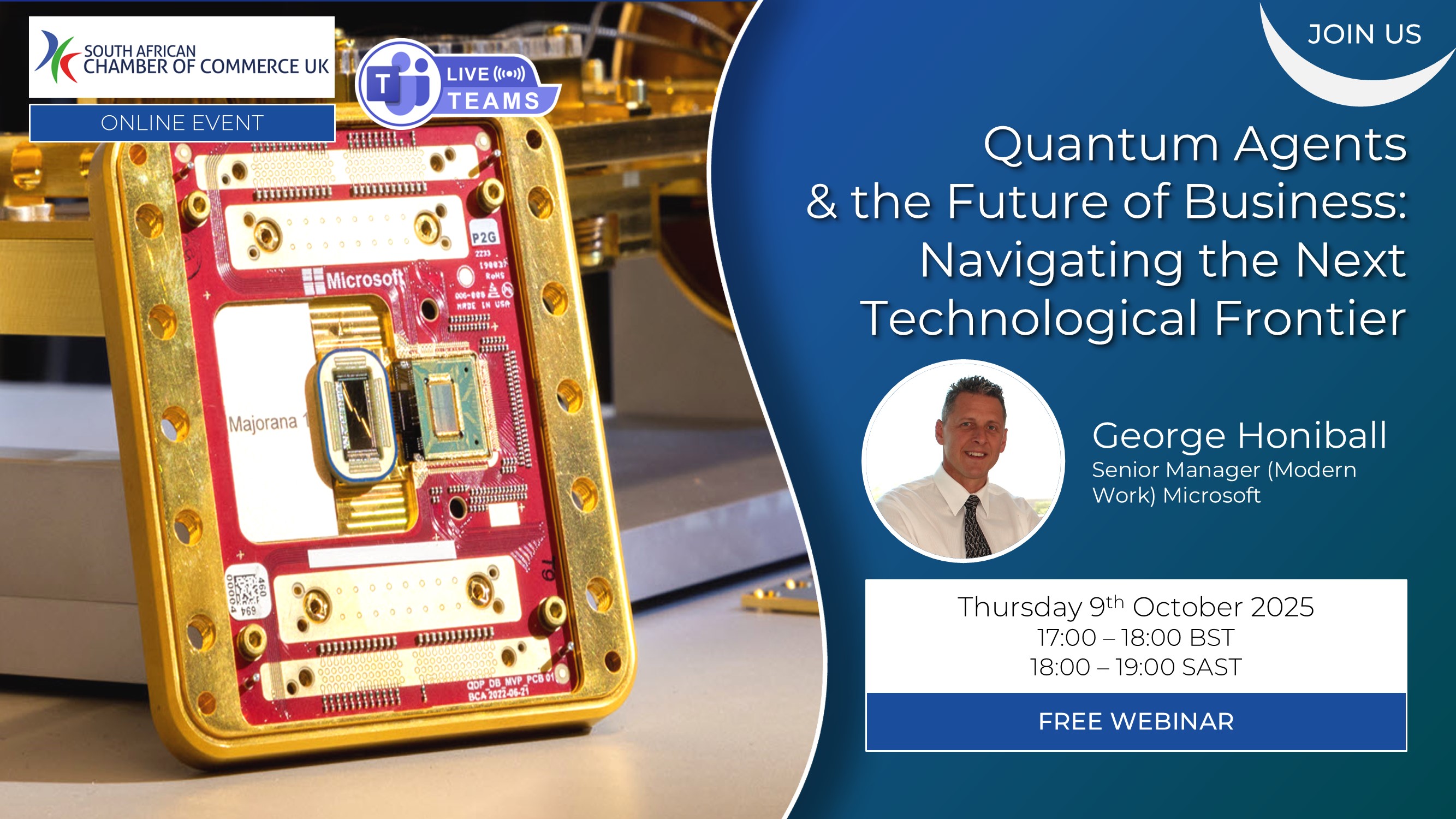 From 17:00 on Thursday 9 October 2025, we will explore how quantum computing and intelligent agents are transforming industries, enabling new business models, and reshaping competitive advantage, beyond any single vendor or platform. From demystifying quantum computing to uncovering real-world use cases in energy, finance, healthcare, and beyond, our expert-led discussions will highlight how the convergence of quantum technologies and intelligent agents is redefining enterprise strategy. This is a must-attend session for business leaders who want to understand the opportunities, challenges, and strategic implications of this next technological revolution. Our speaker is George Honiball, Senior Manager (Modern Work) supporting strategic Microsoft customer accounts in Europe with Viva (a new Employee Experience platform), ex-Deloitte, ex-KPMG and SACC Exco member. The following topics will be covered: 1. Quantum Computing Demystified The talk will be followed by a Q&A Session, inviting discussion on industry-specific opportunities, challenges and adoption of timelines, risks, and investment strategies. Watch the replay: