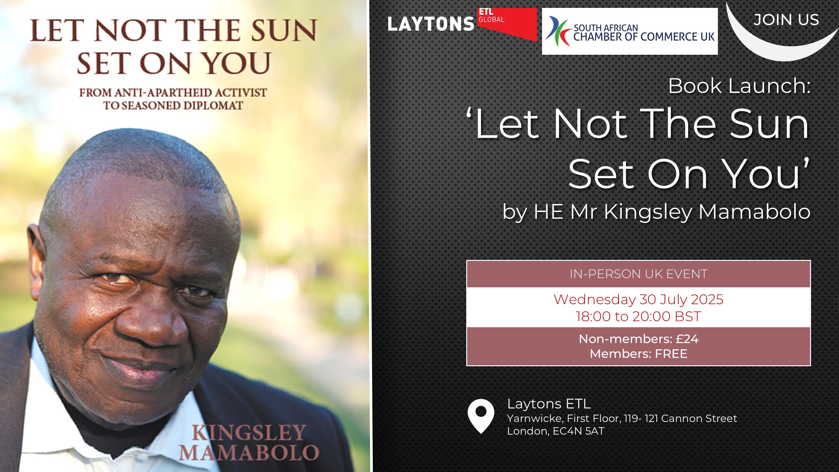Book Launch – ‘Let Not The Sun Set On You’His Excellency Kingsley Mamabolo is South Africa’s High Commissioner to the UK. In his autobiography, published earlier this year, he talks about his life growing up in the dusty streets of Soweto, on the outskirts of Johannesburg, to joining the African National Congress at the height of the anti-apartheid struggle and subsequently going into exile in various countries including Angola, Germany, Russia, Cuba, and Tanzania. The struggle for him is not only for freedom but also learning to survive without family and away the country that he loves. |