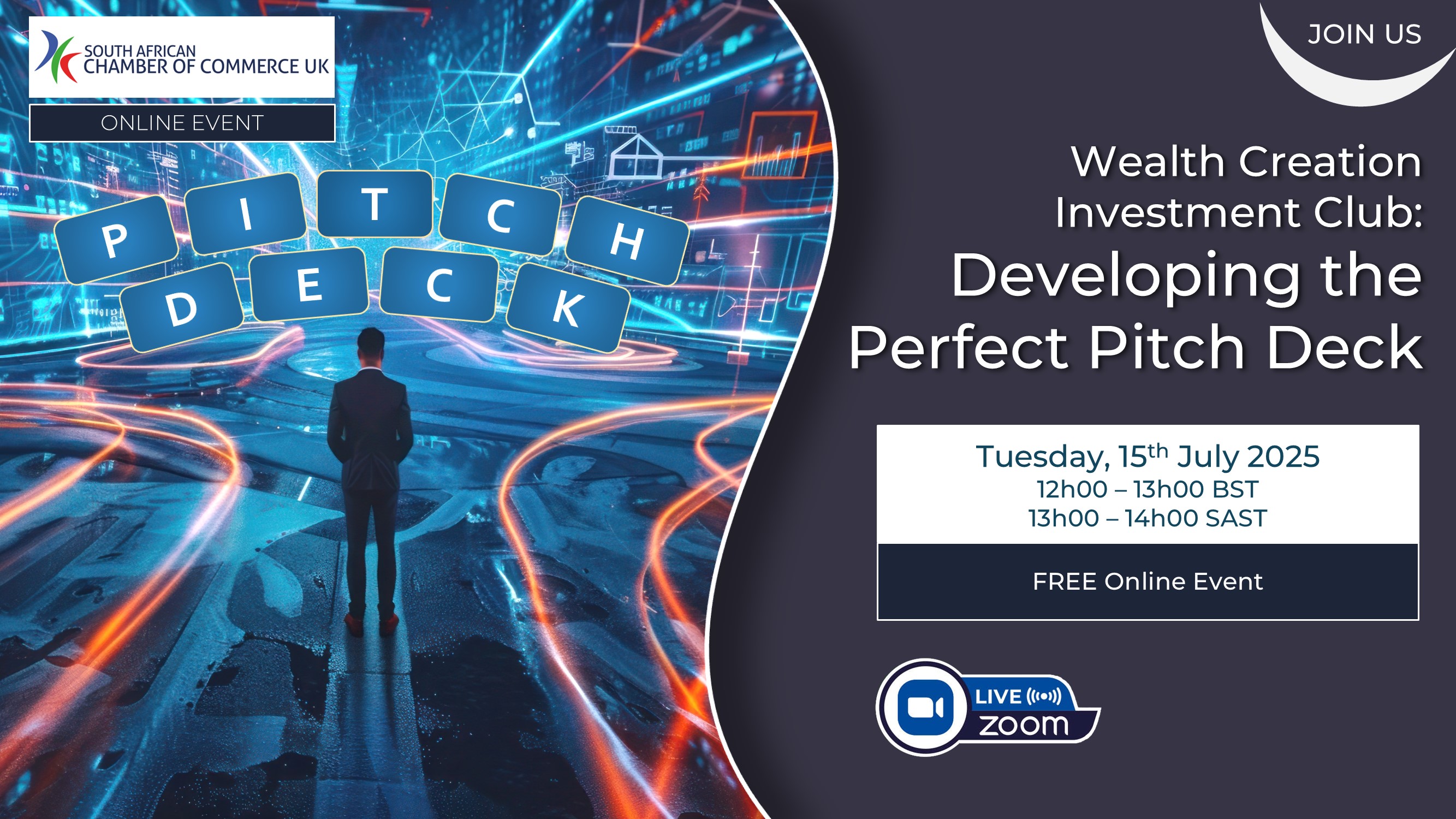 Presented by the Wealth Creation Club of the South African Chamber of Commerce UK, this session will equip attendees with the tools, insights, and frameworks needed to confidently present business opportunities that resonate with investors; illustrated with practical examples of pitch decks which delivered, and those which didn’t. Whether you’re preparing to raise capital, refine your business proposal, wanting to understand the anatomy of a compelling pitch, or an investor wanting to gain insight into high-quality-presentations, this webinar is for you. Watch the replay: Ajay Lalu Ajay Lalu is a qualified Chartered Accountant and Certified IoT Professional as well as co-founder & director of the Consumption Information Real Time (CIRT) and Q-HOP. He won Innovator of the Year in 2021. Ajay participated in the Deutsche Bank BEE transaction valued at an estimated R1 billion. Prior to negotiating the Deutsche Bank deal, Ajay was the Director for BEE services at EY. He was appointed to the Presidential BBBEE Advisory Council in 2022. Ajay spent 5 years at Ernst & Young in the Corporate Finance arena and was promoted to Director M&A. Ajay is a keen photographer, runner, cyclist and loves to travel. He is deeply committed to changing the lives of ordinary South Africans through his involvement in various NGOs. He is passionate about developing SMMEs based on his real-life experiences. This event is free to attend, but prior registration is essential. Zoom links will be sent out in the 24 hours before the event.