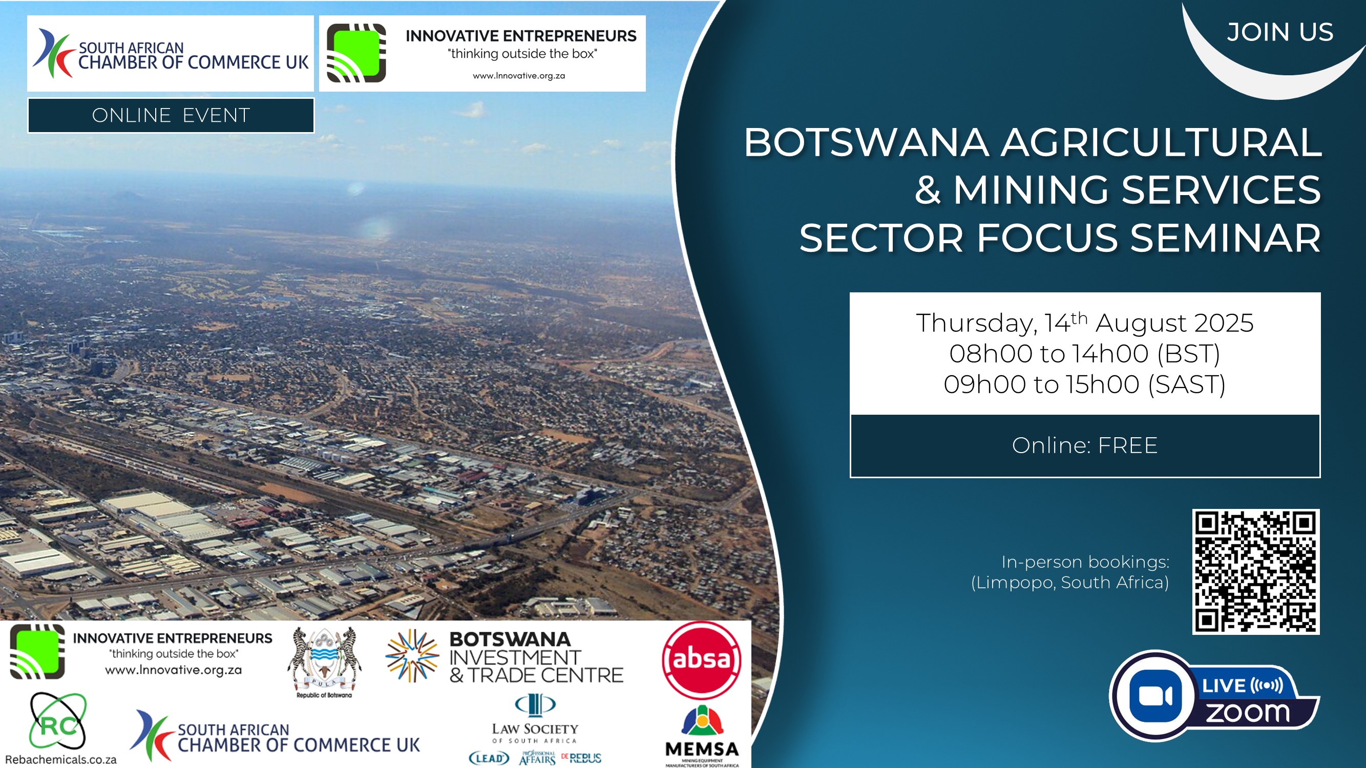 Innovative Entrepreneurs NPC will be hosting the Botswana Agriculture and Mining Sector Focus Seminar in collaboration with the Botswana High Commission in South Africa and the Botswana Investment and Trade Centre (BITC) based in South Africa on Thursday 14 August 2025. Event Highlights: - Debswana Diamond Company and Morupule Coal Mine will be sharing opportunities available within their supply chain for SA Mining Services Sector companies to take advantage of - Trade and investment opportunities in Botswana's Agricultural and Mining Services Sectors. - Realities and Costs of Doing Business, Available projects, Investment Opportunities, Modalities for Trade and Investment (Bi-Lateral Agreements, Trade Protocols), Tax Incentives and much more. Focus Areas: Dairy | Cannabis | Horticulture | Aquaponics | Mining Services Who should attend: Managing Directors; CEO’s; Executives; New Bus. Development Directors, Exporters & Importers; Sales and Marketing Directors; Transportation & Logistics Directors; Risk & Finance Directors; Legal & Contract Administrators; International Bankers; Purchasing Directors; Forwarders; Customer Service & Customs Brokers; any companies considering expanding their brand into Botswana. For additional information, please contact: Arlene Wilson-Max on Cell: 079 108 0613 or Email: arlene@innovative.org.za Happiness Fosi on Cell: 061 845 2023 or Email: projects@innovative.org.za Lois Peters on WhatsApp: 066 106 4420 or Email: diversity@innovative.org.za To register to attend in person, please click here. |