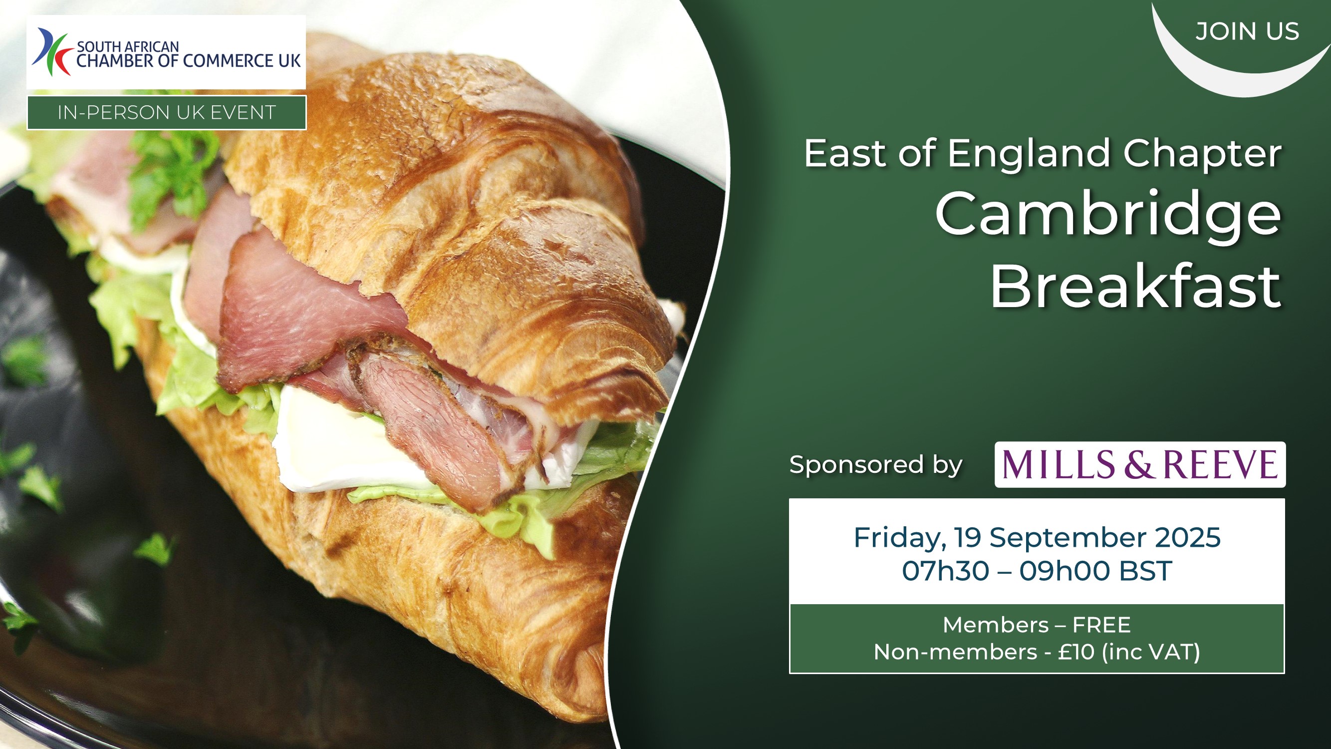 With the support of our esteemed sponsor, Mills & Reeve LLP, a leading national law firm with long-standing and deep roots in East Anglia and a strong international outlook, the time is perfect to reconnect. Who Should Attend? If you’re a South African professional based in the UK, or someone in the UK with an interest in South Africa, this event is for you. Whether you’re looking to expand your network or simply connect with like-minded individuals, you’ll find a warm South African welcome here. Why Attend? • Expand your network Getting There: The venue (Botanic House) is a five-minute walk from Cambridge rail station. The closest parking is at the Cambridge rail station, and the nearest Park & Rides are at Babraham Road, about 2 miles south of Botanic House, and Trumpington, about 3 miles from Botanic House. Buses run every 10 minutes to the rail station. Cycle racks are available at both Cambridge station and Botanic House. Booking Details: Booking is essential, as places are strictly limited. To secure your place, please book as soon as possible. Booking is only available via the website and bookings are only final once payment has been received, and may be cancelled if no payment is received within 24 hours. Price: Dietary Requirements: