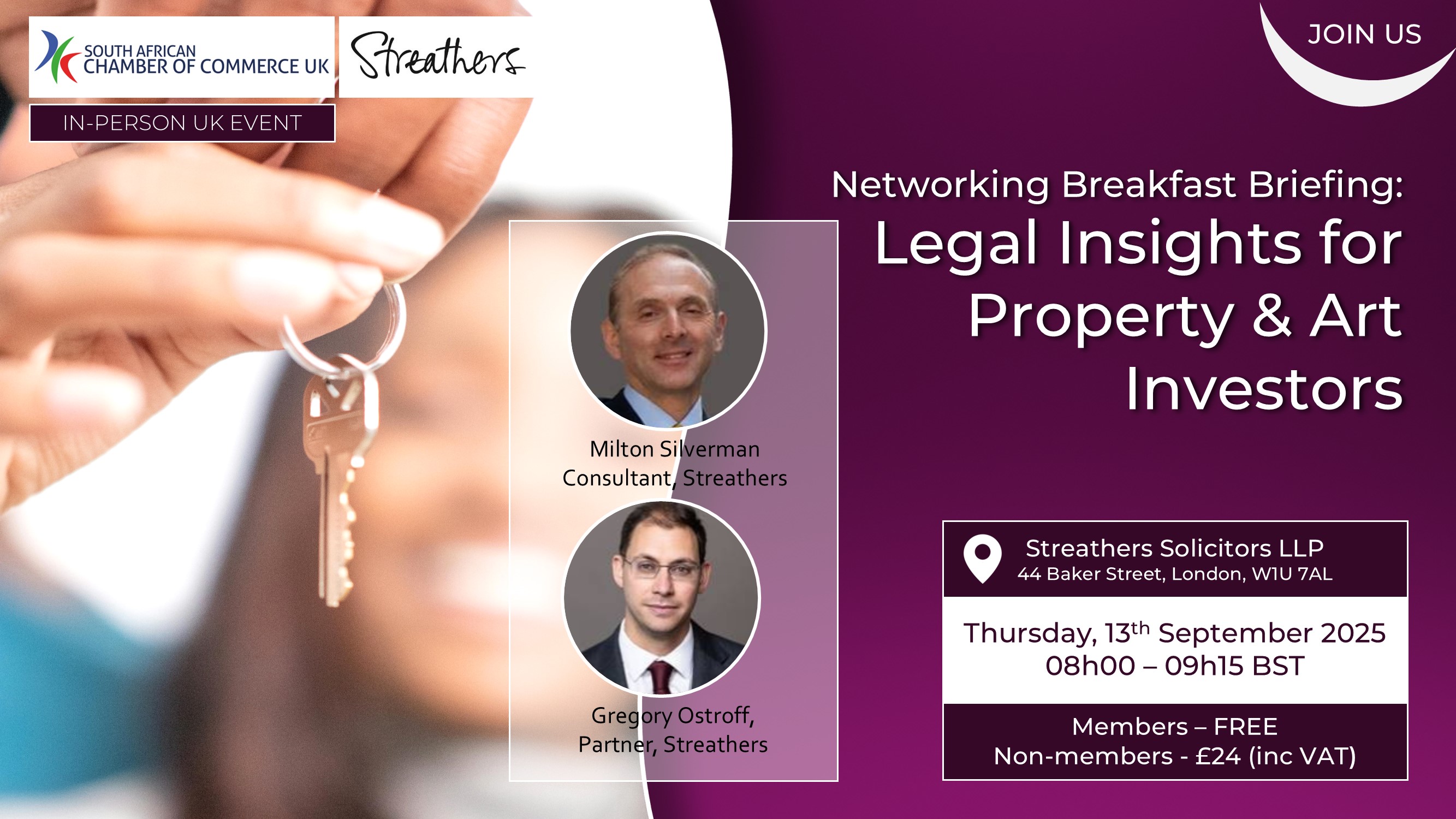 Gain expert insights, connect with fellow members of the South African Chamber of Commerce UK, and expand your professional network, all while enjoying a light breakfast. We are delighted to welcome two speakers from Streathers Solicitors: Gregory Ostroff – Partner, Dispute Resolution Department Gregory specialises in high-value and complex commercial and property disputes, with extensive trial experience and a strong track record of success. In his talk, Gregory will cover crucial legal issues surrounding commercial leases, including renewals and termination – essential knowledge for anyone investing in UK property. Milton Silverman – Consultant, Dispute Resolution Department Milton has been a key figure in commercial litigation since 1984 and brings deep expertise in the art and cultural property sector. He has advised internationally, lectured at institutions such as Sotheby’s Institute, and served as the legal correspondent for the Antiques Trade Gazette. Milton will explore the emerging tensions between artists and the AI industry, and share insights into the evolving government response. Members: Free of Charge Non Member: £20 + VAT
