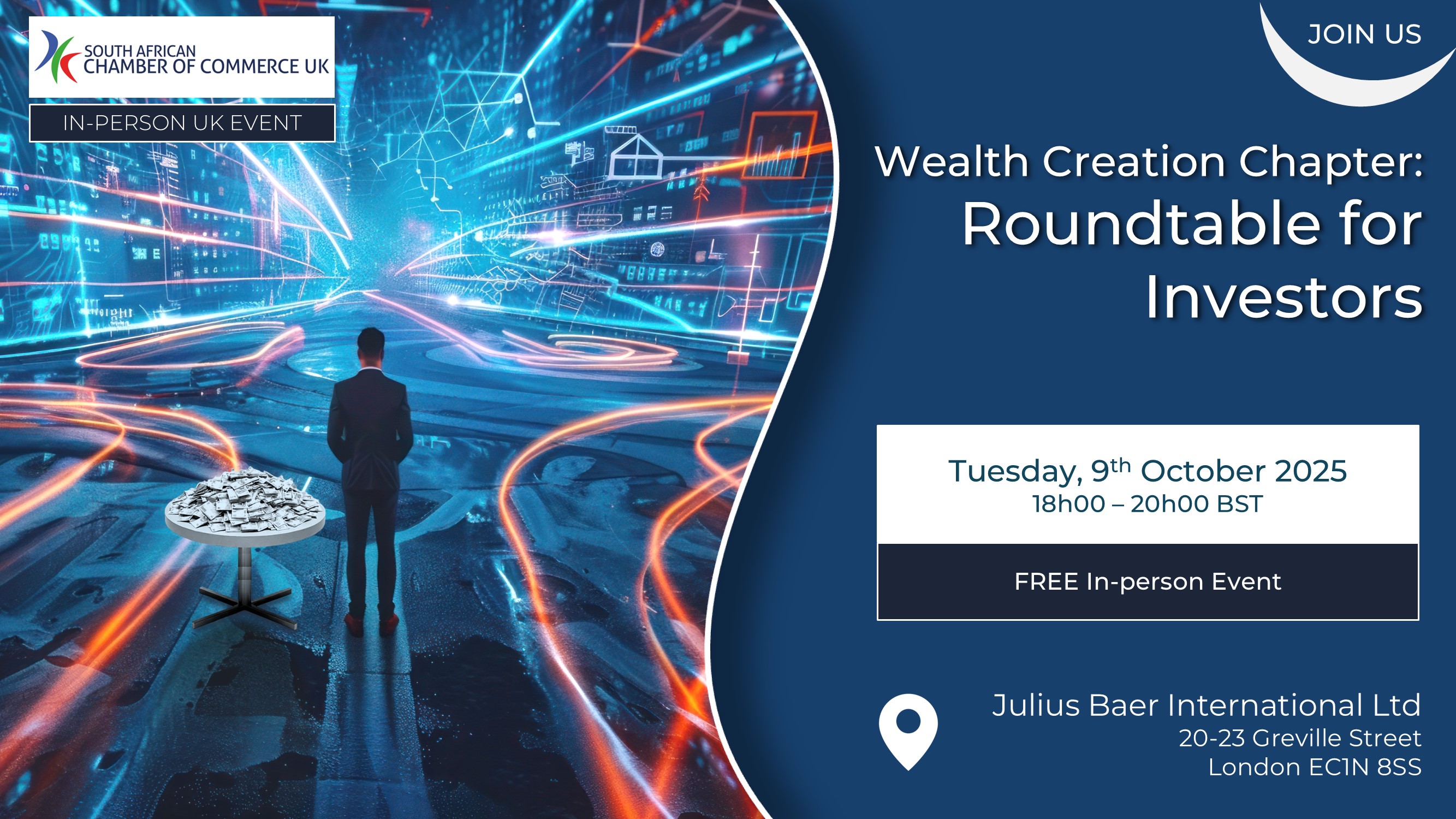 Wealth Creation Chapter: Roundtable for InvestorsThe South African Chamber of Commerce Wealth Creation Chapter is proud to host its inaugural Round Table for investors – an exclusive, invite-only gathering designed to spark dialogue, share insights, and shape the foundation of our new investor club, hosted at the London offices of Julius Baer International Ltd from 6pm on Thursday, 9 October. |