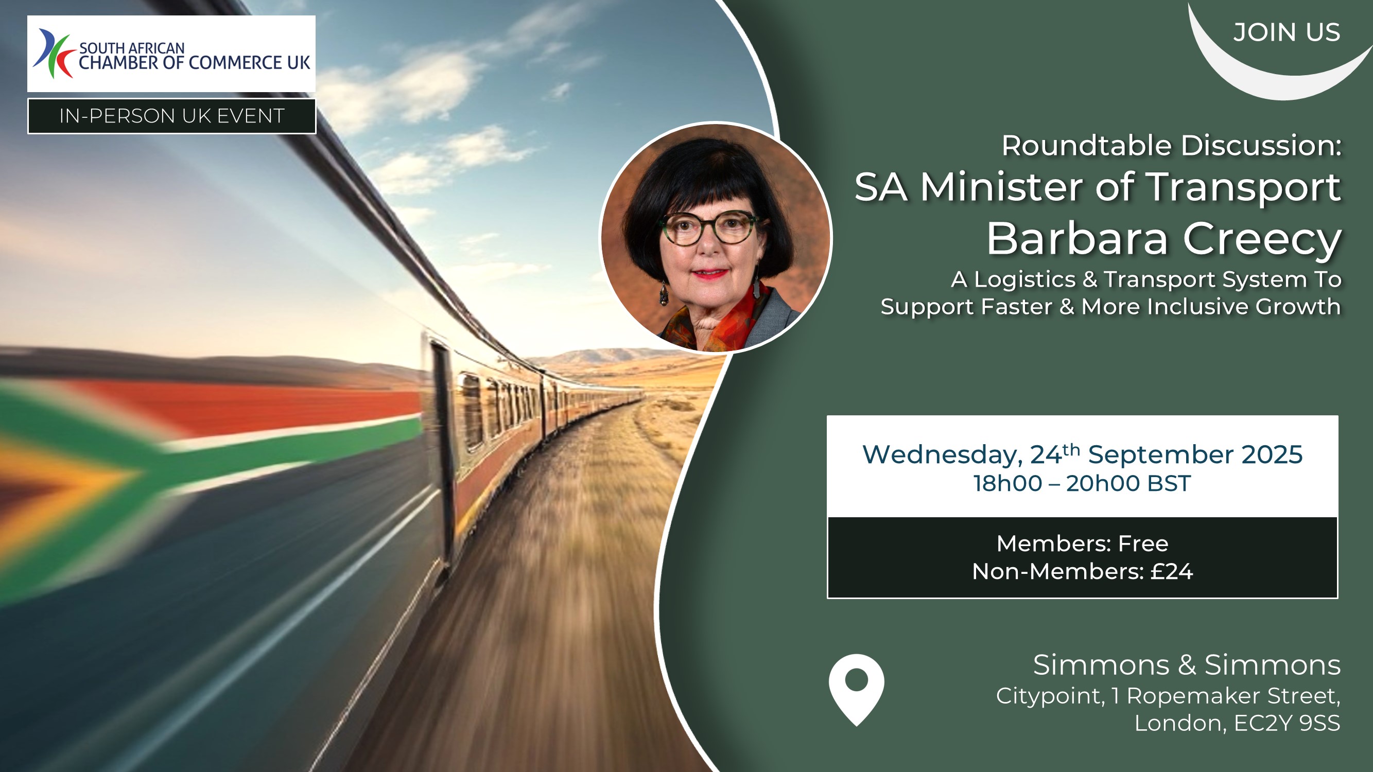 A Logistics & Transport System To Support Faster & More Inclusive Growth The South African Chamber of Commerce UK is delighted to host Honourable Barbara Creecy, South Africa’s Minister of Transport, for a high-level roundtable discussion on the future of logistics and transport reform in South Africa. Logistics reform started gaining traction through the last administration as it became a key priority of the Presidency’s “Operation Vulindlela” structural reform group, the adoption by cabinet of the far-reaching vision of the Freight Logistics Roadmap and the creation of the National Logistics Crisis committee (which has worked on both operational and structural reform efforts around the sector). Efforts to make the sector fit to support faster and inclusive growth of the South African economy have been redoubled with the arrival of Minister Barbara Creecy into the role of Minister of Transport last year after the elections - taking control not only policy issues here but also the shareholding responsibility for Transnet. With the Chamber’s ongoing interest in infrastructure and series of events on the topic in recent years - we are therefore delighted to welcome Minister Creecy to London and host her for a private sector engagement roundtable to hear about the government’s reform efforts and the role for the private sector in this. We will be joined by chamber members and leaders from the logistics sector in the UK to have a detailed engagement and discussion. Members: Free of Charge Honourable Barbara Creecy Ms Creecy served as the Minister of Forestry, Fisheries and the Environment of the Republic of South Africa between 2019 and 2024. In November 2019, Ms Creecy was also elected as the President of the African Ministerial Conference on the Environment (AMCEN). Ms Creecy is one of the leaders of the African National Congress (ANC) and currently serves as a member of the National Executive Committee and National Working Committee. Ms Creecy was one of the longest serving Members of the Gauteng Provincial Legislature. She joined the legislature in 1994, and until 2004, served in different portfolios including Deputy Chief Whip as well as Chairperson of the Social Development and Education Committees. Minister Creecy holds an Honours Degree in Political Science from the University of the Witwatersrand and a Masters Degree in Public Policy and Management from the University of London.