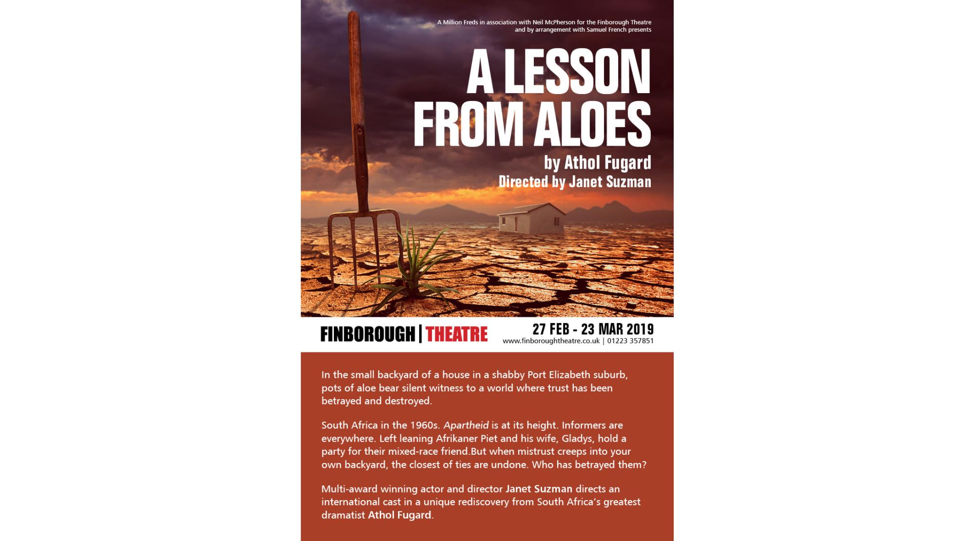 "Our race is a mistake." In the small backyard of a house in a shabby Port Elizabeth suburb, pots of aloe - the desert plant that can thrive in the most barren soil - bear silent witness to a world where trust has been betrayed and destroyed. South Africa in the 1960s. Apartheid is at its height. Mandela's ANC has just been banned as a terrorist organisation. Informers are everywhere. Left leaning Afrikaner Piet and his wife, Gladys, hold a party for their mixed-race friend Steve who has just been released from prison. But when mistrust creeps into your own backyard, the closest of ties are undone. Who has betrayed this group of friends? And why is one of them on a one way ticket out of the country? Unseen in London since its UK premiere at the National Theatre 35 years ago where it was directed by Athol Fugard himself and won rave reviews, this new production directed by Janet Suzman marks the 25th anniversary year of the first free and democratic elections in South Africa. The original production of A Lesson From Aloes premiered at the Market Theatre Johannesburg in 1978, where it provoked huge controversy and narrowly escaped being banned. The Broadway production won the New York Critics Circle Award for Best New Play.