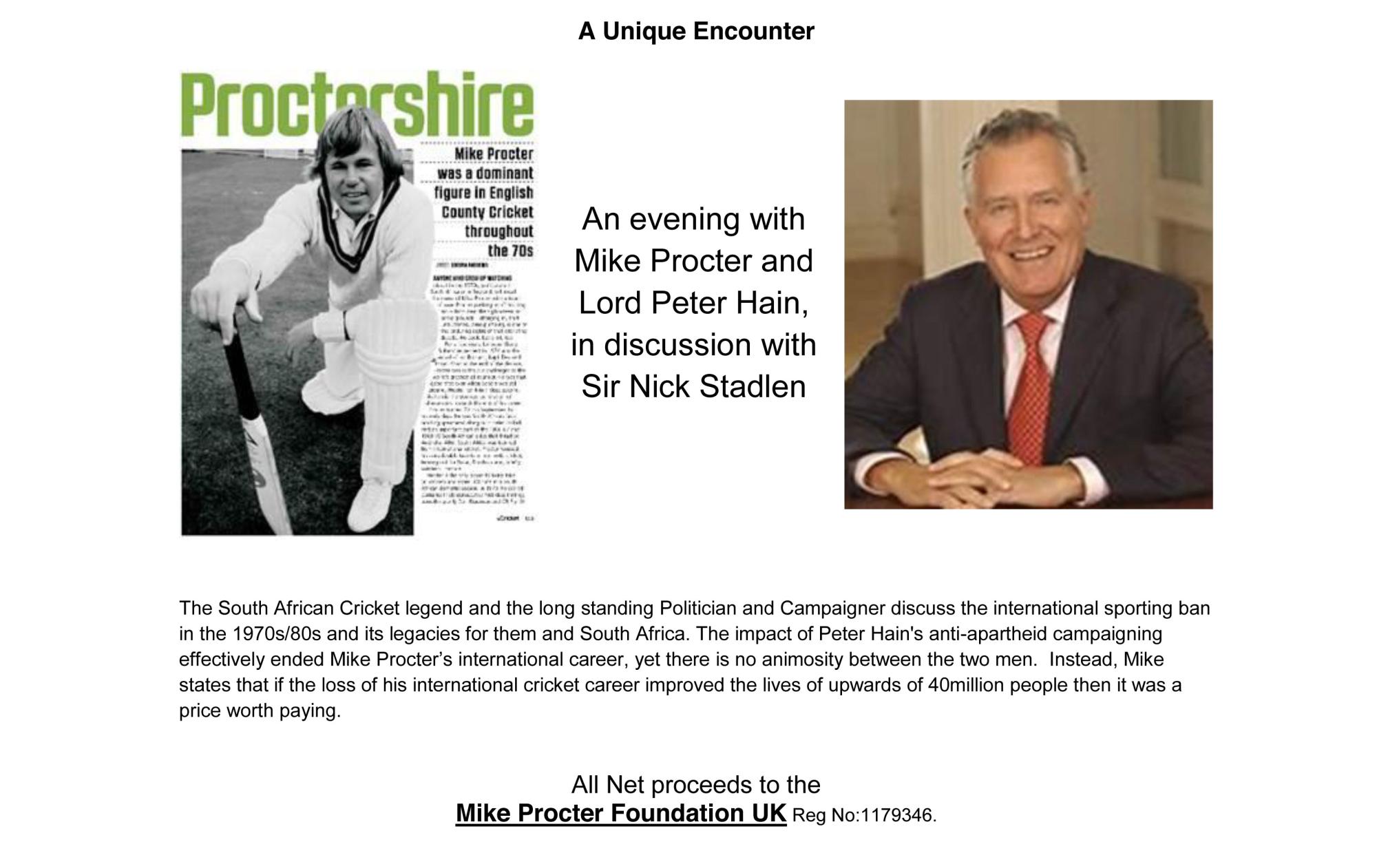 The Mike Procter Foundation UK invites you to a unique encounter between well-known Politician and Campaigner Lord Peter Hain and South African Cricket Legend Mike Procter. Both men worked against the iniquities of apartheid in their different capacities during their respective careers and are meeting to discuss their experiences at South Africa House, Trafalgar Square on 10 July. This discussion will start at 6.30pm and finish at 8.30pm and will include a Q&A. Sir Nick Stadlen will moderate the discussion. Tickets cost £30 and include canapés and drinks and a free signed copy of Mike's book "Caught in the Middle". Please visit the site below to purchase tickets: