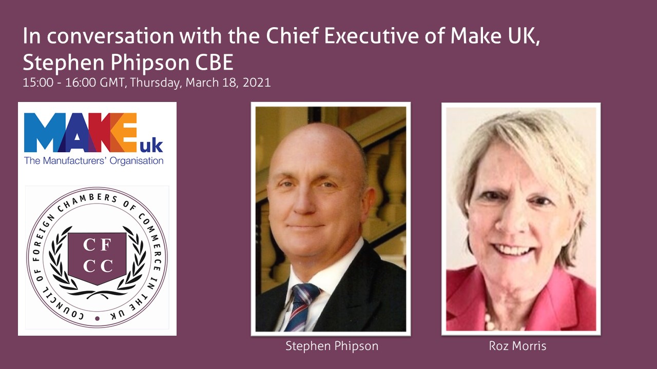 In conversation with the Chief Executive of Make UK, Stephen Phipson CBEAs a member of the SACC, join us at 3pm on Thursday, March 18th for a Council of Foreign Chambers of Commerce webinar with Stephen Phipson CBE, Chief Executive of Make UK, moderated by Roz Morris, Managing Director, TV News London Ltd. |