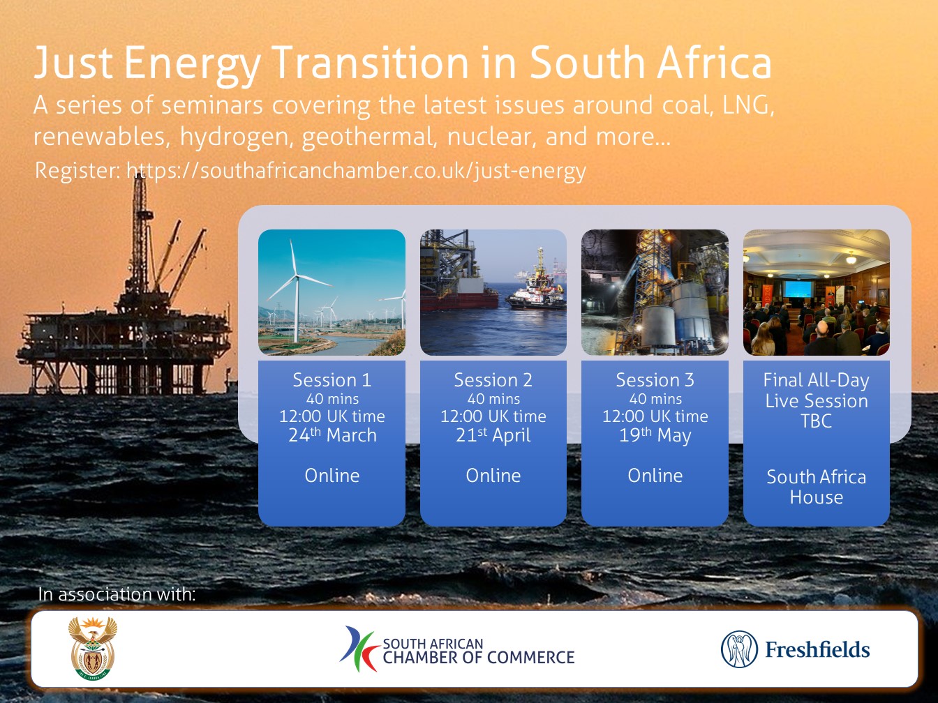Expanding South Africa’s energy capacity is the only way to save the country’s economy, according to the South African Minister of Mineral Resources and Energy, Gwede Mantashe. • Peter Attard Montalto – Chair, Director of the South African Chamber of Commerce (UK) & Intellidex • David Bamford - Moderator, Chief Science & Technology Officer at Future Energy Partners Ltd • Bhavtik Vallabhjee – Head of Absa Corporate & Investment Banking’s Power, Utilities & Infrastructure team • Amanda Mapanda – Freshfields, Energy, Transportation and Infrastructure team This is the first part in a series of webinars looking at "Just Energy Transition in South Africa". Access to the webinars is open to everyone, but the final event which will take place at the South African High Commission will be by invitation only. If you'd like to be invited, please register your interest here. This event is free, but booking is essential. Zoom links will be sent out in the 24 hours prior to the event.