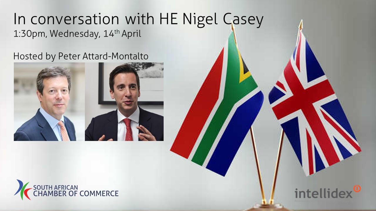 In Conversation with HE Nigel CaseyJoin South African Chamber of Commerce Director, Peter Attard Montalto, in conversation with Nigel Casey, outgoing British High Commissioner to South Africa. Nigel has served as High Commissioner from 2017, his second stint in Pretoria after seeing in the transition from apartheid to democracy in a posting from 1993-1995. |