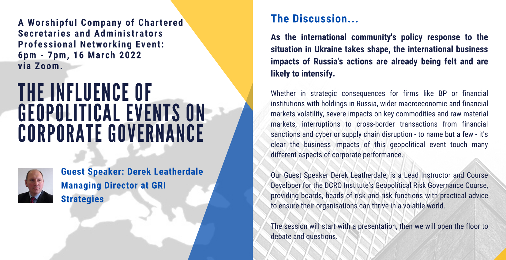 Guest Speaker Derek Leatherdale is a Lead Instructor and Course Developer for the DCRO Institute's Geopolitical Risk Governance Course, providing boards, heads of risk and risk functions with practical advice to ensure their organisations can thrive in a volatile world. Derek supports companies across industry sectors to develop resilience and thrive amidst increasing global geopolitical volatility. Founder of HSBC's group geopolitical risk function and Associate Director at the Risk Coalition, leading Risk Thinking on corporate management of geopolitical risk. Co-author of 'The Extra G - ESG Squared: principles-based guidance for geopolitical risk oversight and its integration with ESG issues for boards, risk committees and risk functions'. The session will start with a presentation, then we will open the floor to debate and questions. This event will be video recorded for public viewing at a later date.