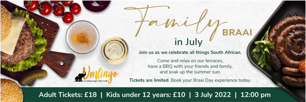 Limited tickets are available. Reserve your Braai Day experience today. Tickets: Adults: £18 | Kids under 12 years: £10 | Date: 3 July 2022 | Time: 12:00pm What To Expect On The Day?