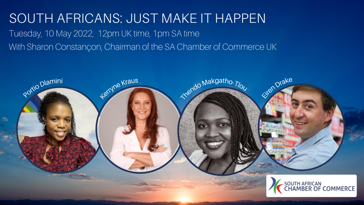 South Africans: Just Make It HappenYou are cordially invited to join us for a webinar discussing entrepreneurship with Kerryne Krause, Eiren Drake, Thendo Makgatho-Tlou & Portio Dlamini, from 12pm to 1pm BST / 1pm to 2pm SAST on Tuesday, 10th May. |