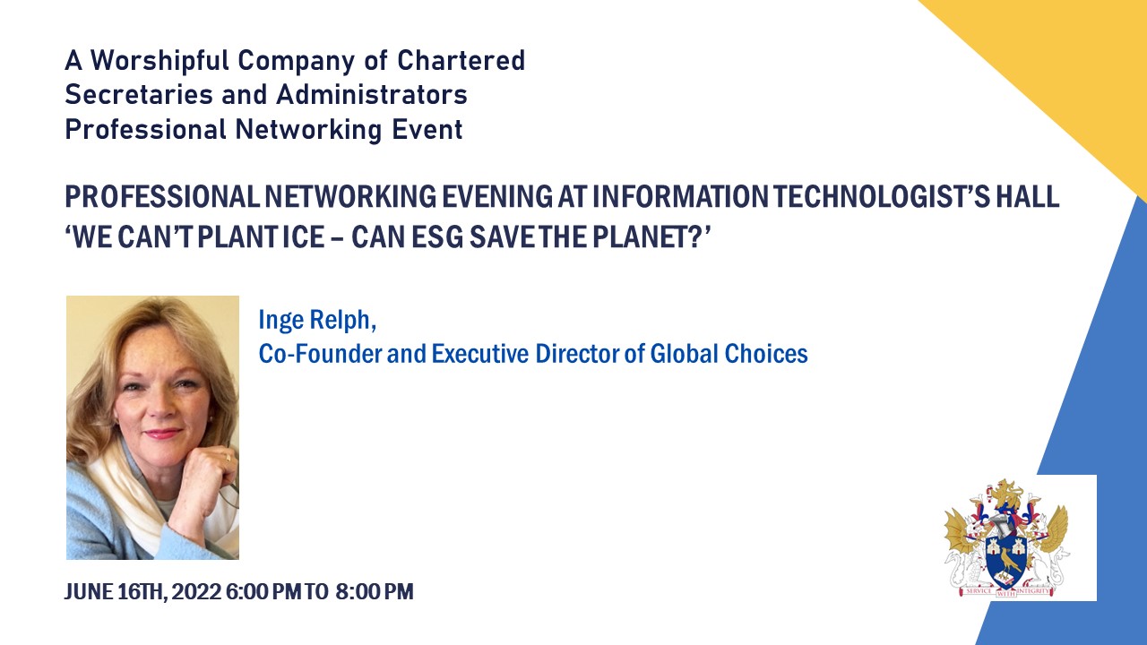 ‘We Can’t Plant Ice – Can ESG Save The Planet?The WCCSA June 2022 Professional Networking Evening is to be held at The Worshipful Company of Information Technologists Hall. Included in the booking price will be a topical presentation, before networking with wine, soft drinks and nibbles! |