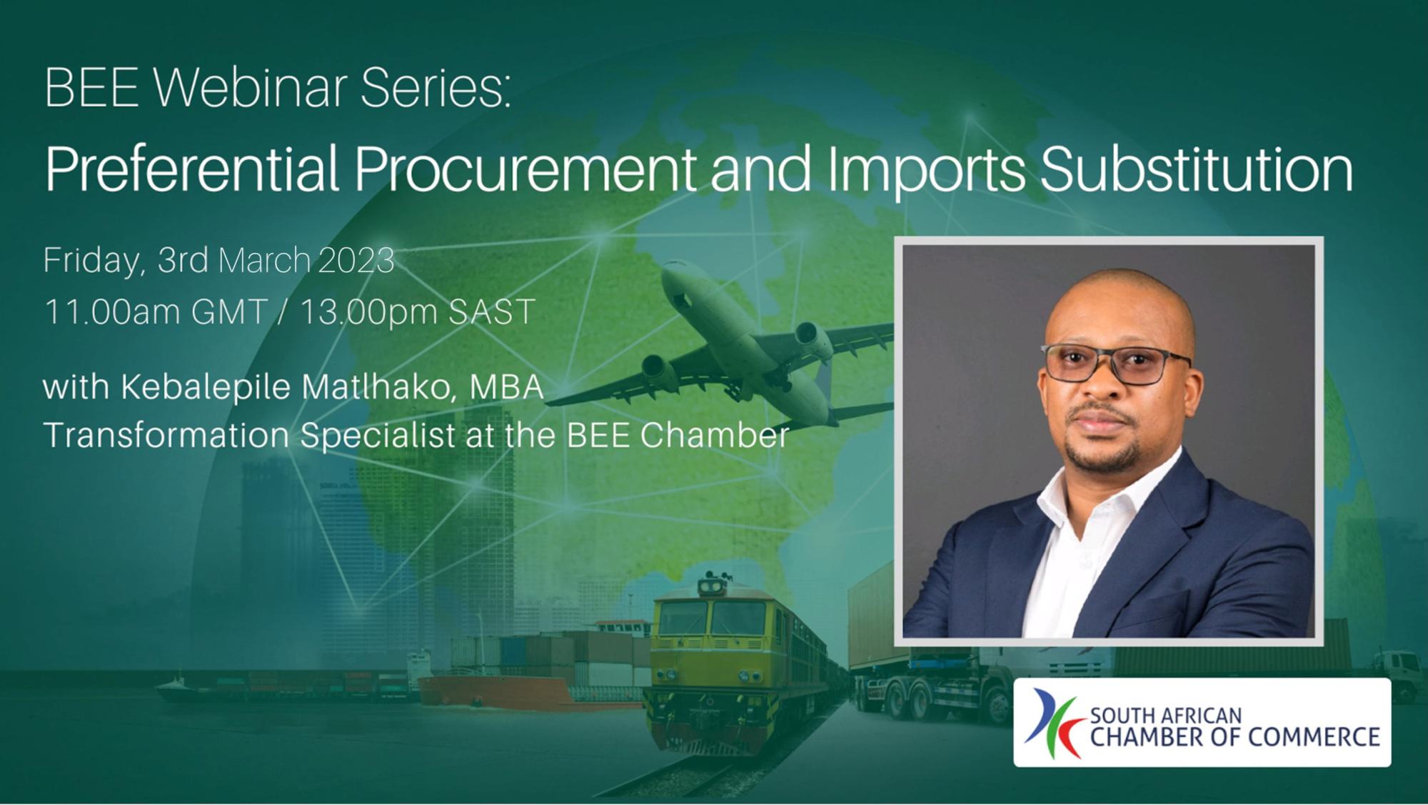 BEE Series: Preferential Procurement and Imports SubstitutionThis is the third webinar in the BEE series. In this webinar Kebalepile Matlhako, Service Desk Transformation Specialist at the BEE Chamber will be in conversation with the SACC on Preferential Procurement and Imports Substitution. |
