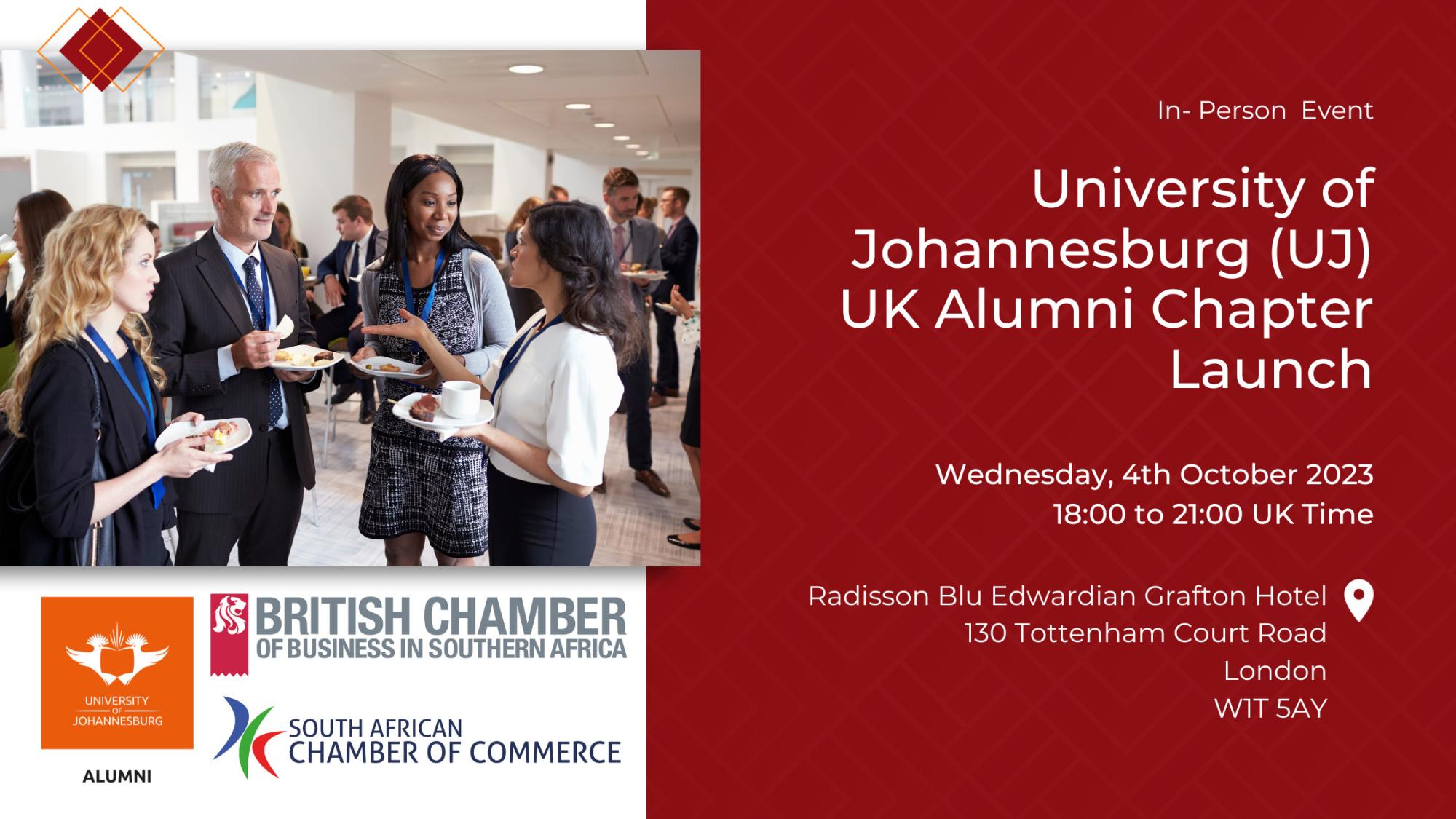 University of Johannesburg (UJ) UK Alumni Chapter LaunchPlease join us on 4 October to celebrate the launch of the new UK Alumni chapter of the University of Johannesburg. The guest speaker will be Professor Letlhokwa Mpedi, the Vice-Chancellor and Principal of UJ. The event will be held in partnership with the South African Chamber of Commerce UK and the British Chamber of Business in South Africa. |