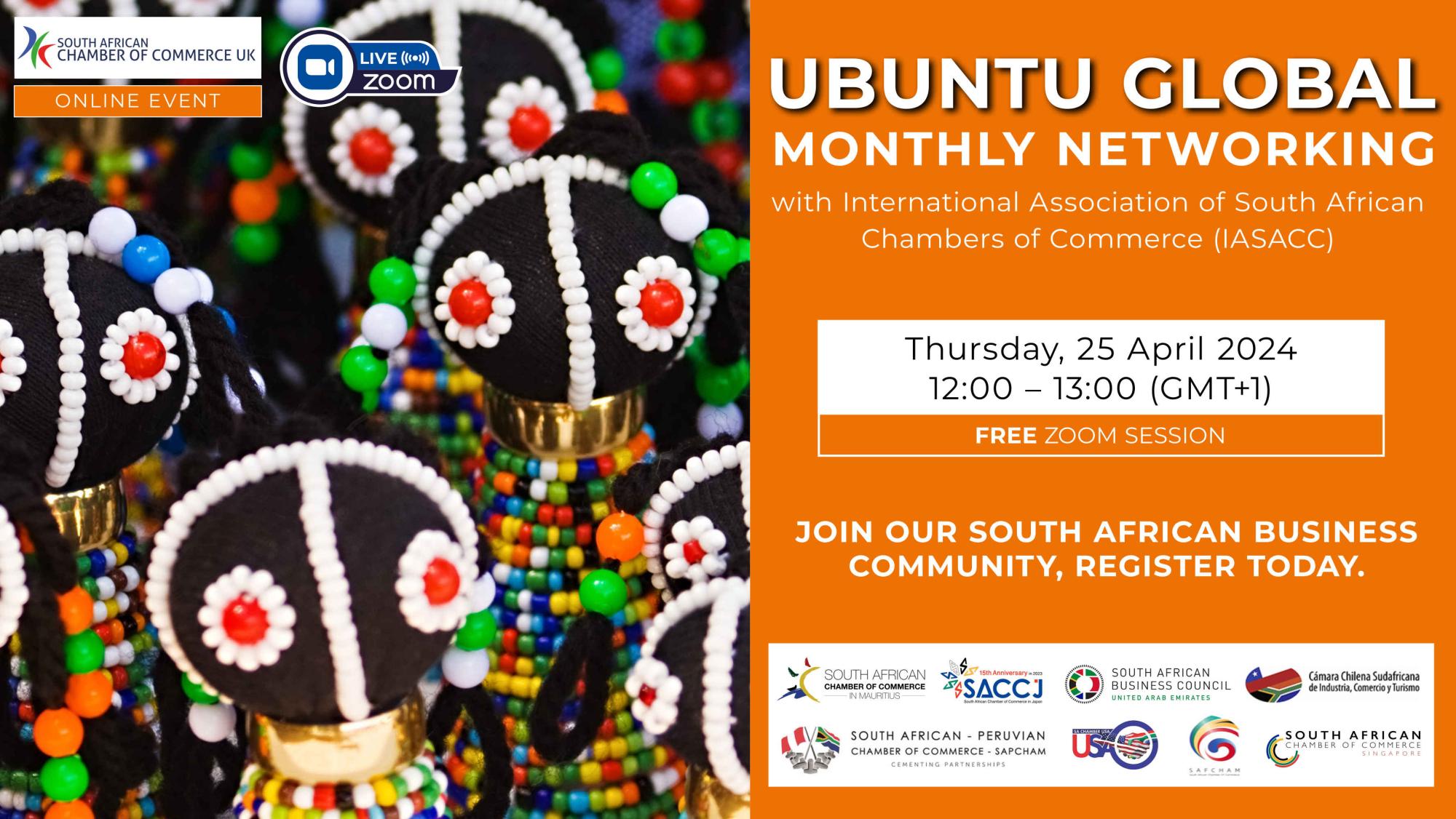 We have now joined forces with the SA Chamber in UK and will co-host their Ubuntu Virtual Global Networking event on 25th April. We are very excited about this opportunity and will be giving members of the SA Chambers the ability to connect with each other and help build their global networks.” You are cordially invited to join us for a our networking webinar at 12h00 UK time / 13h00 SA time on Thursday, 25 April 2024 on Zoom. Attending our monthly global networking event, on the last Thursday of each month, not only provides a valuable platform to connect with professionals from diverse industries but also embraces the spirit of ubuntu, a fundamental philosophy deeply rooted in South African culture. Ubuntu emphasizes the interconnectedness and importance of community, fostering a sense of togetherness and collaboration. • Expanding professional connections, in the UK and SA Participation is free, but registration is essential. Zoom links will be sent out in the 24 hours prior to the event.