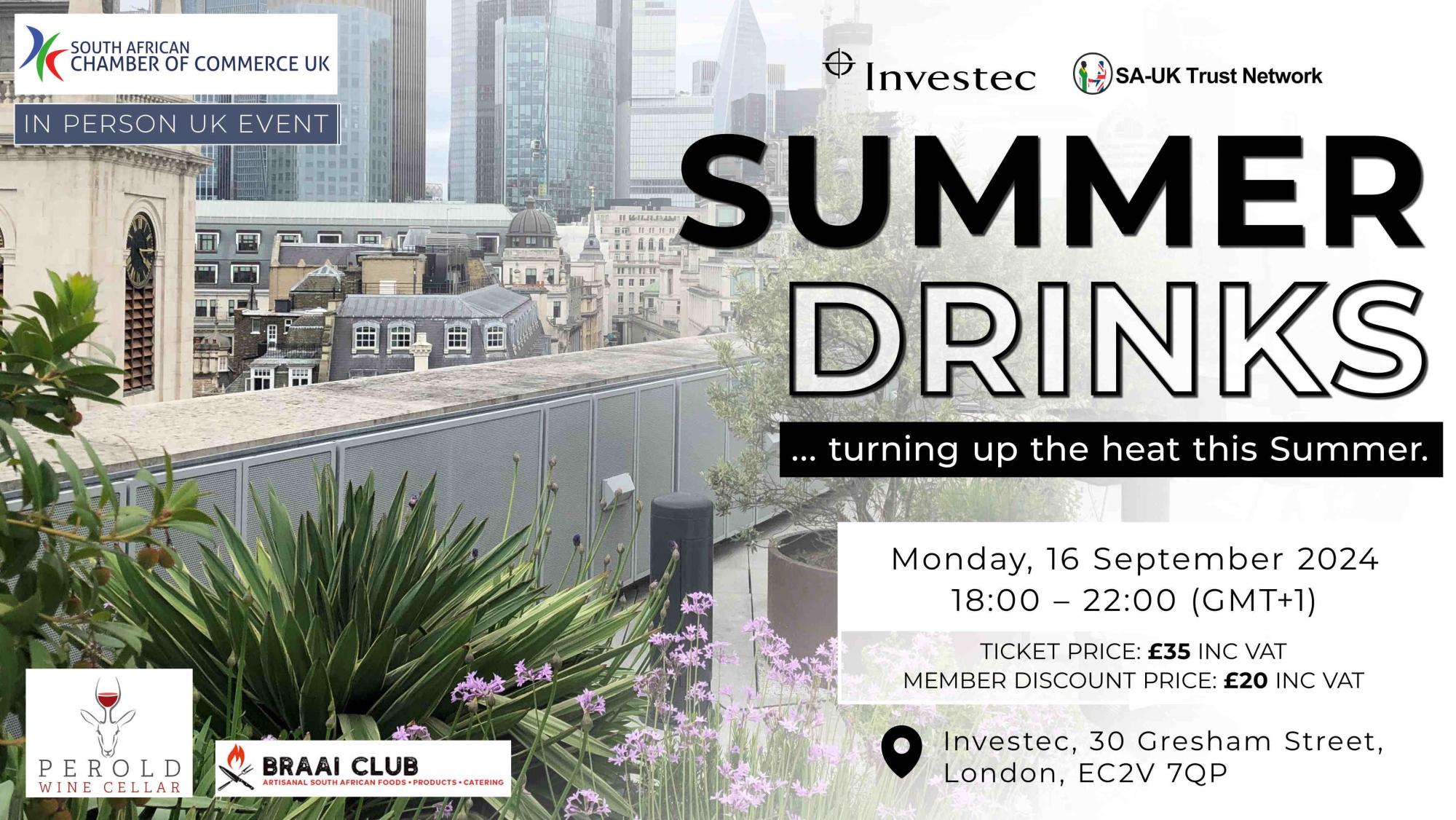 Summer DrinksPlease join us for the annual South African Chamber of Commerce UK Summer Drinks. Graciously hosted by Investec on their stunning rooftop terrace with breathtaking views over London, this event promises to be a highlight of the summer. It will be a fantastic opportunity to network with fellow South Africans, share business insights, and build valuable connections in a relaxed and elegant setting. |