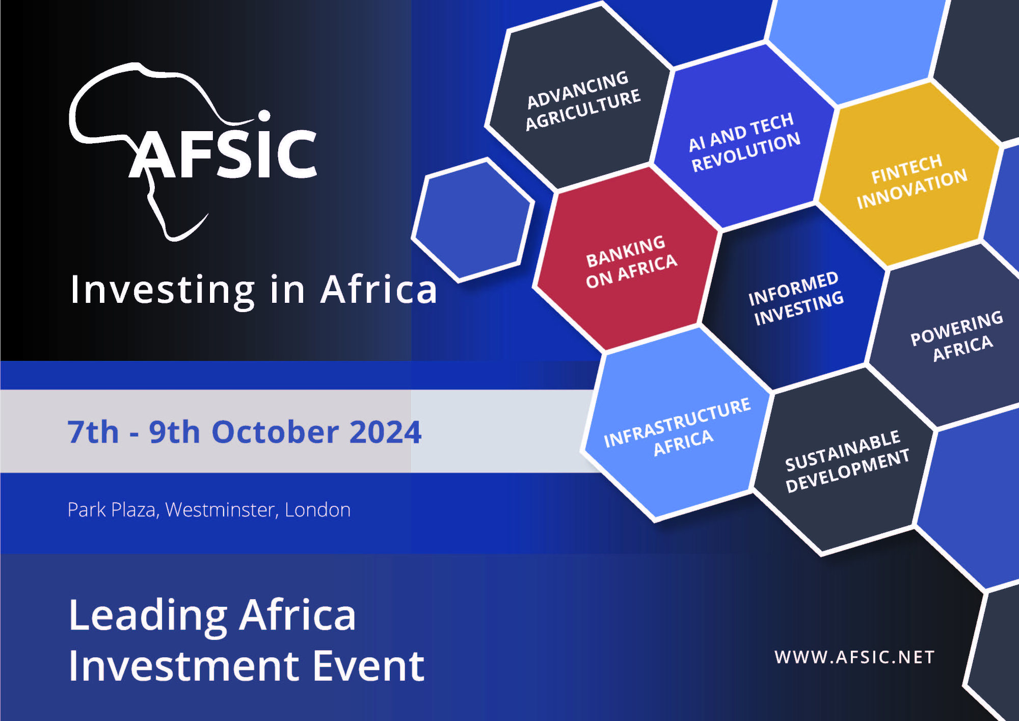 AFSIC - Investing in Africa 2024AFSIC – Investing in Africa has for more than a decade focused on nurturing investment and collaboration across the investment value chain and driving sustainable growth in Africa. AFSIC – Investing in Africa 2024 will offer delegates more than just leading edge content as the investor networking opportunities are expanded and investor ready projects from the African Investments Dashboard are profiled through the AFSIC Deal Book and in on-site project pitching. |