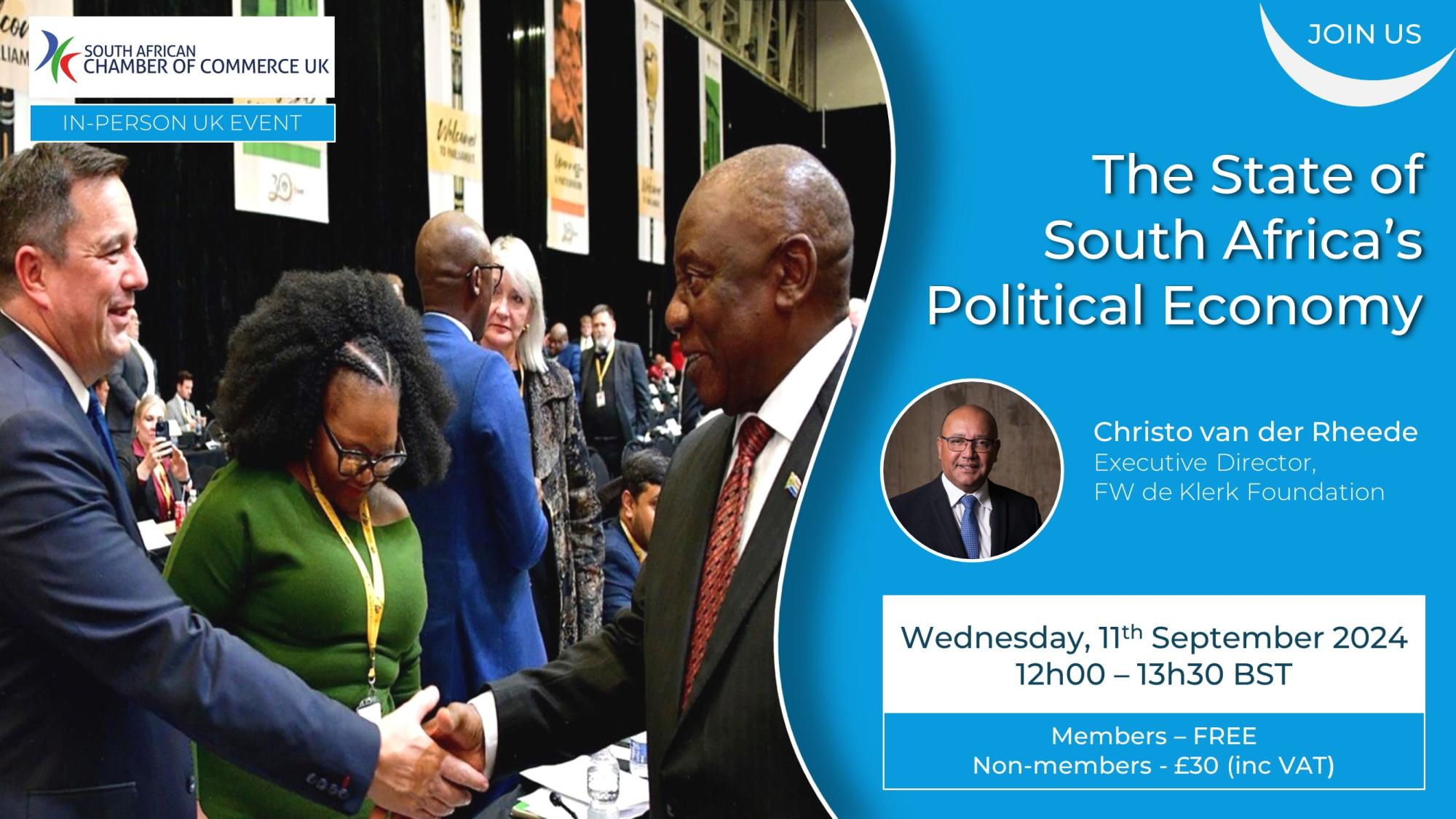 The State of South Africa’s Political EconomyPlease join us at 12pm on Wednesday 11 September, at Simmons & Simmons, 1 Ropemaker Street, London, EC2Y 9SS, for a discussion on "The state of South Africa's political economy" with Christo van der Rheede, Executive Director of the FW de Klerk Foundation. |