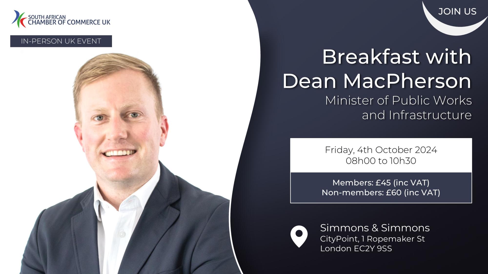Breakfast Round Table with Minister Dean MacPhersonWe are delighted to host the Minister for Public Works and Infrastructure, Dean MacPherson, for a Breakfast Round Table from 08h30 on Friday, 4th October at the London offices of Simmons & Simmons. |