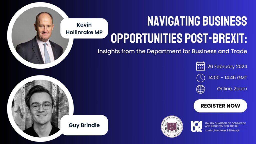 Join us on February 26th at 2pm for an exclusive webinar organised by the Italian Chamber of Commerce and Industry for the UK, in collaboration with the Council of Foreign Chambers of Commerce (CFCC). This event will feature distinguished speakers: Parliamentary Under Secretary of State (Minister for Enterprise, Markets, and Small Business) Kevin Hollinrake MP, along with his Senior Private Secretary, Guy Brindle.Â