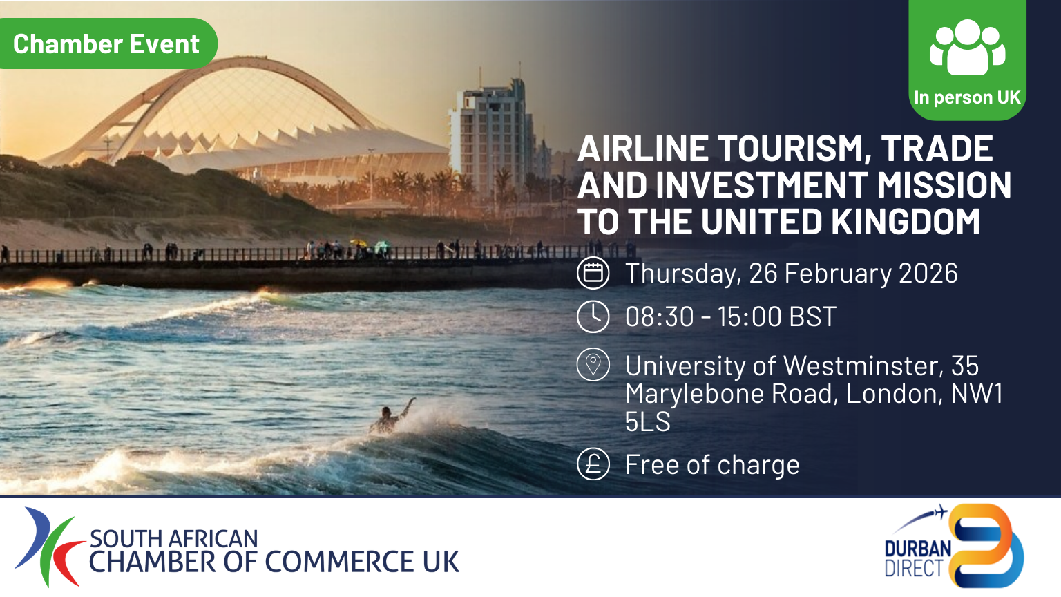 Durban Direct, together with KwaZulu‑Natal partners, invites UK businesses to a focused in‑country activation mission designed to deepen trade and investment ties, strengthen air‑route connectivity, and spotlight catalytic opportunities across KZN. The morning briefing will set the scene; the afternoon B2B matchmaking connects UK firms with KZN counterparts.